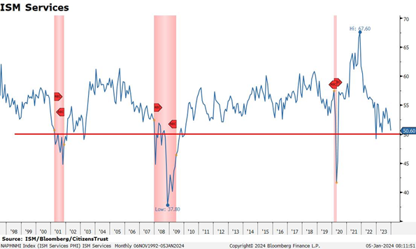 The services sector is the largest segment of the U.S. economy and is less cyclical and volatile than the manufacturing sector. As measured by the ISM Services index, the indicator was above 50, indicating expansion, for every month during 2023. This is the opposite of the ISM Manufacturing index, which spent every month of 2023 below 50, indicating contraction. The services sector is significantly larger than the manufacturing sector and more than offset the weakness in manufacturing. However, this indicator will be watched closely in 2024 as any break below 50 for an extended period of time is a timely indicator of an economic contraction.